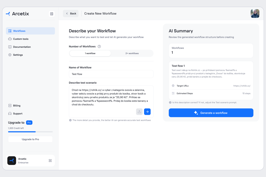 Arcetix využíva AI a dokáže generovať testy automaticky, na základe textového zadania, produktovej špecifikácie alebo priamo z rozhrania webovej aplikácie.